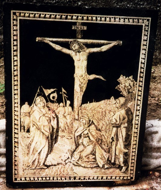 Restoration work on an eighteenth-century scagliola tile, belonging to a series of the Via Crucis.